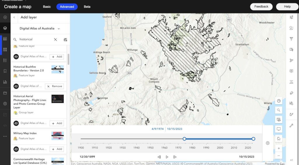 The Digital Atlas of Australia has an overlay which provides a graphical mapping of historical bushfires boundaries dating from 1899 to 2023. The overlay can be filtered to provide visual evidence of bushfires which have occurred in the vicinity of a given community or council area.